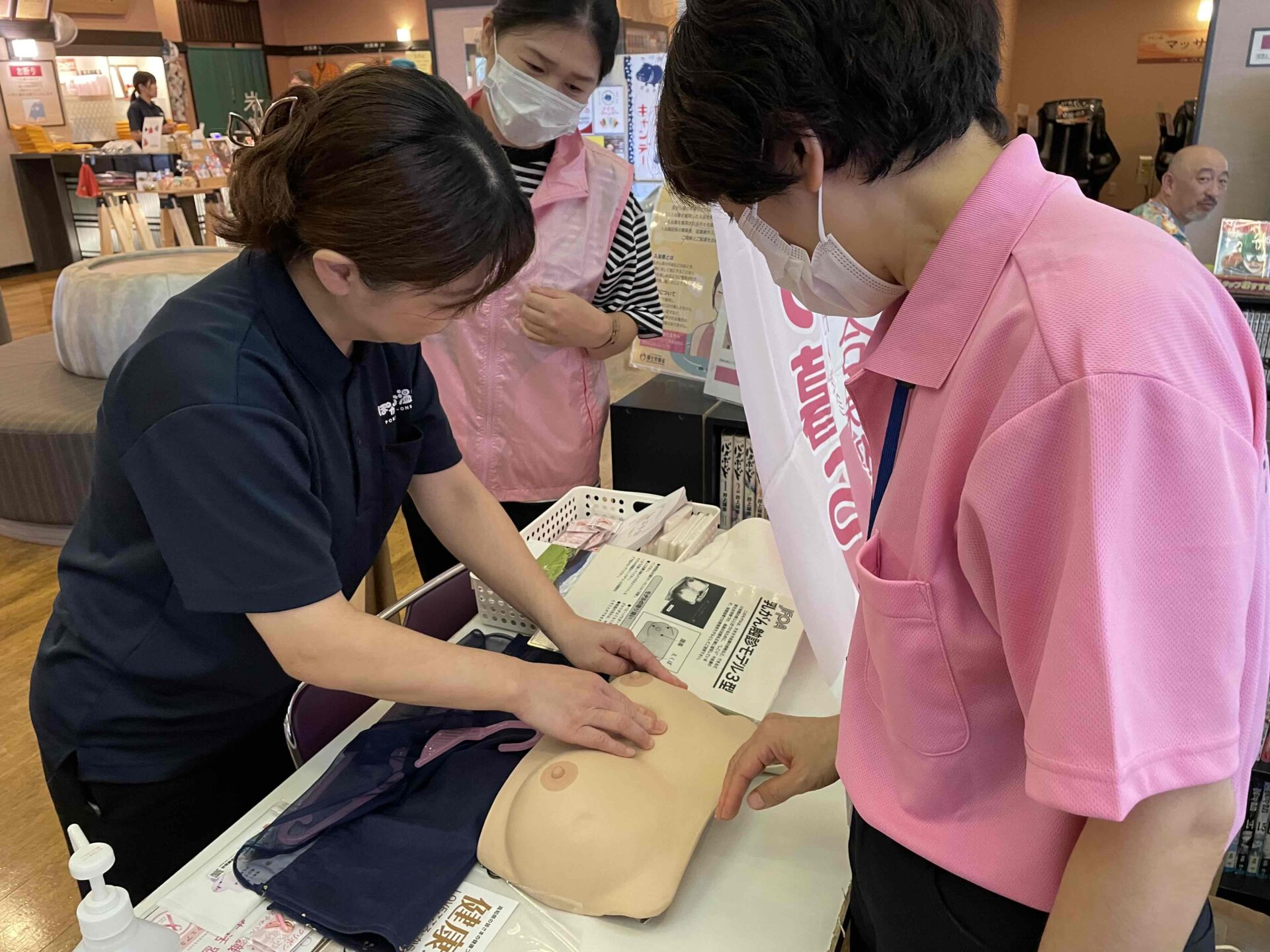 “ピンクリボンの湯”の開催 2025年10月5日(日)高知市神田の土佐ぽかぽか温泉において、10月の乳がん啓発月間に合わせて乳がんの啓発イベント“ピンクリボンの湯”が開催されました。土佐ぽかぽか温泉様は当日、男湯・女湯それぞれのお湯をピンク色に演出し、先着200名の女性のお客様に乳がん啓発の入浴剤をプレゼントされるなど「地域の方々に楽しみながら健康意識を高めていただきたい」と取り組まれました。 きっかけは“バスタイムカバー” 土佐ぽかぽか温泉様が今回のイベントを企画したきっかけは、乳がん治療のための手術を控えたお客様から、術後に入浴着“バスタイムカバー”を着用して入浴してよいかというご相談でした。入浴はもちろん可能で、本イベントを通じて、他のお客さまにも入浴着があることを知っていただきたい、との思いを持たれたそうです。当日は体験ブースに入浴着を展示することで、多くのお客様に見ていただくことができました。 当協会の活動内容 当協会は、啓発資料の配布に加え、乳房の触診モデルを使用し、乳がんのしこりを実際に触れて体験できるブースを設置するとともに、保健師と当協会が事務局をつとめる乳がん術後者の会「いぶき会」によるブレスト・アウェアネス(乳房のセルフチェックや日常的な気づきの大切さ)についての啓発を行いました。今では女性の9人に1人が乳がんになると言われています(※1)。皆さんもお風呂や着替えのときなどに、ブレスト・アウェアネスを習慣付けましょう。 イベント概要 ◆主 催:株式会社創裕 土佐ぽかぽか温泉 様 ◆日 時:2025年10月5日(日) ◆場 所:土佐ぽかぽか温泉(高知市神田1197-1) 出典:※1 国立がん研究センターがん情報サービス「がん統計」 《 PDFで読む》