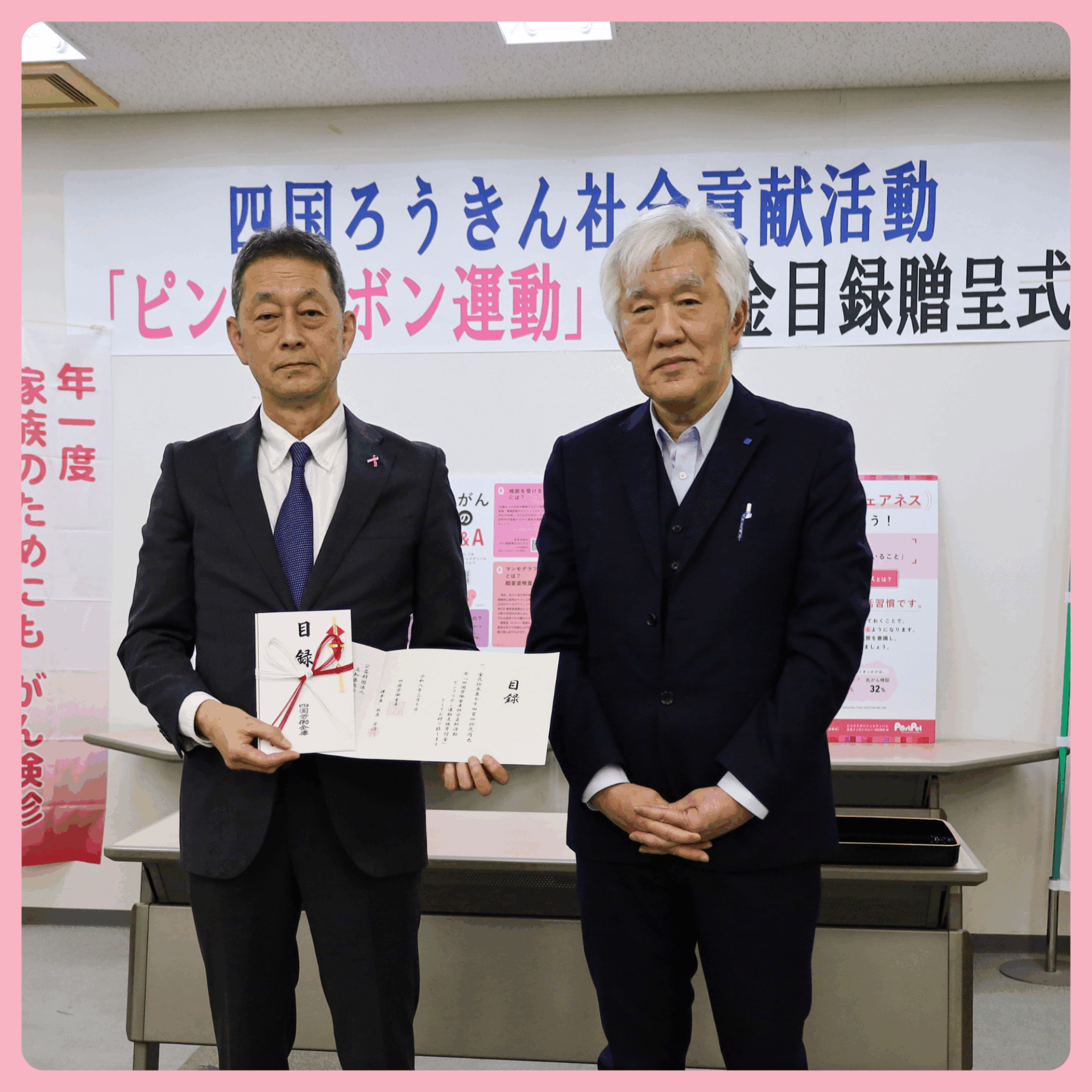 四国労働金庫高知営業本部様からピンクリボン運動へご寄附をいただきました。 四国労働金庫様は「女性が健康で長く働くことができる社会づくり」に貢献するため、“ピンクリボンプロジェクト”と題し、ピンクリボン運動への支援を平成24年度から継続して行っておられます。 利用者様が四国ろうきんATMで現金を1回引き出すごと及びろうきんアプリ契約1契約ごとに1円を四国労働金庫様が負担し、今年度は県内で総額237,442円を、当協会に寄附してくださいました。 ●ピンクリボンプロジェクトについて いただきましたご支援は、乳がんの早期発見・早期治療につなげる活動に使用させていただきます。 取り組み紹介PDFはこちら