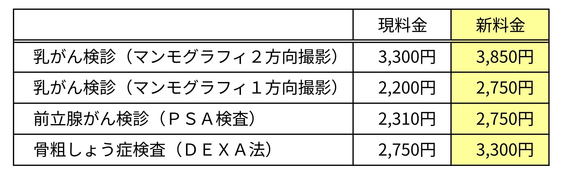 その他、地域健診や特殊健診等に関しても一部の料金改定を行います。 詳しくはお問い合わせください。
